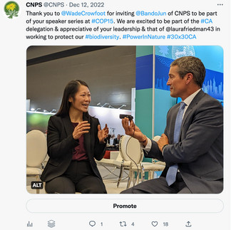 This week we continue our multi-part series on the many facets of the global 30 x 30 conservation efforts as they continue across the state of California as just one example of local, state, and national efforts aggregated. We're in conversation with Jun Bando, the new executive director of the California Native Plant Society, and back in conversation with Liv O’Keefe, the senior director of Public Affairs for the Society. CNPS is an important agency in a larger coalition of agencies and groups contributing to California’s planning, assessment, and projects meeting the goals of 30 x 30 in this one large biodiverse state. A good portion of this broader coalition took part in CNPS’s 2022 conservation conference, entitled Rooting together: restoring connections to plants, place, and people, at which one whole learning track was dedicated to conservation via the 30 x 30 framework and funding as we look ahead.
