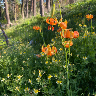 recent views from here: a new to me Calochortus (note the larval friend on the bud!); a damp meadow of bistort looking like a starry sky; a gorgeous dryland rock garden of native western phox and a low fuzzy lupine beyond; the winning combination of native tiger lilies with a yellow pea; sunset on the full moon in June (day after the official solstice); and another new to me Calochortus tomleii (Tolmei's pussy ears).